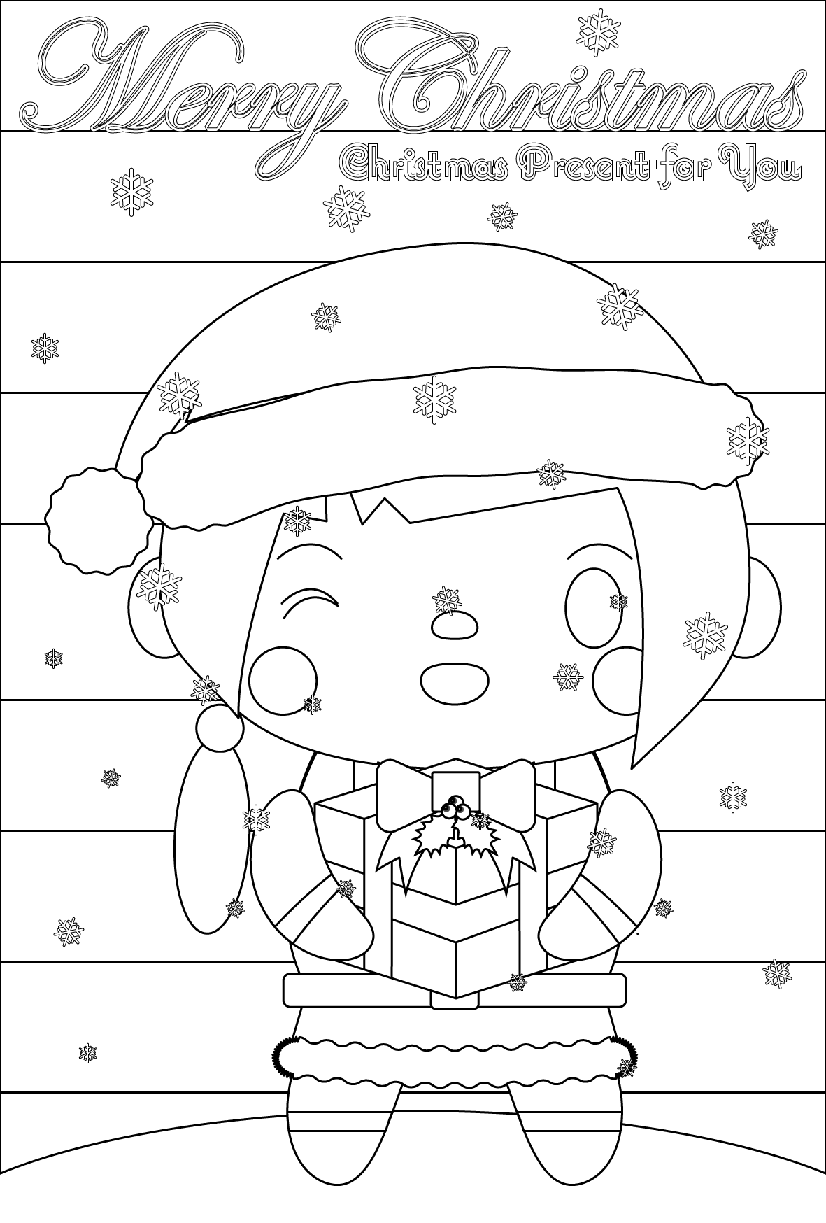 塗り絵に最適な白黒でかわいいサンタ女子のクリスマスカード