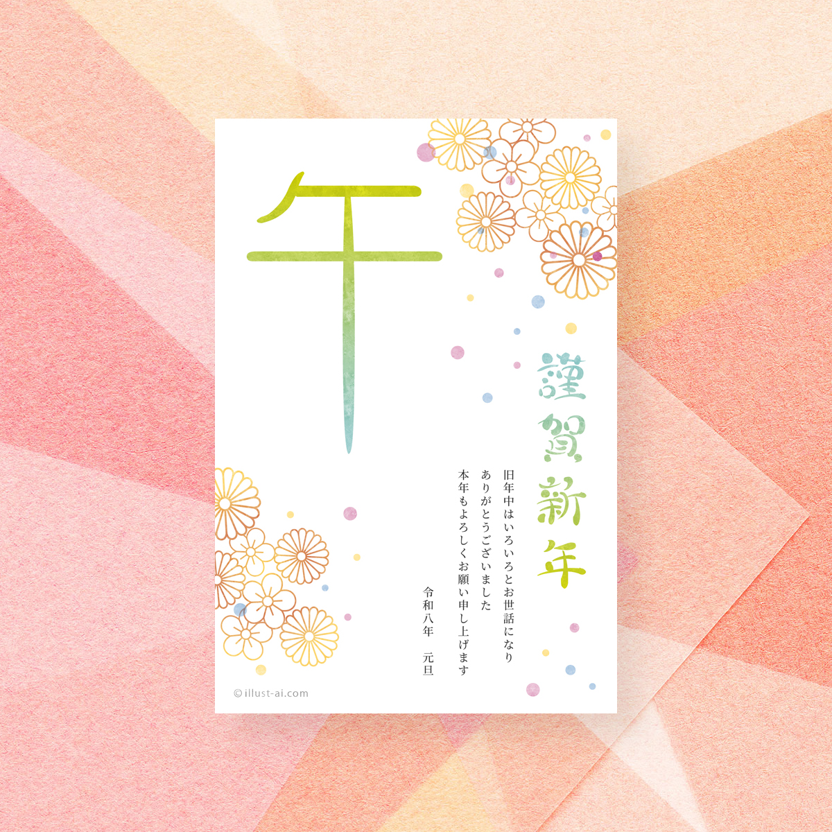 干支のイラストにデザイン賀詞を添えたものは、上部に配置するだけでイラストつきの年賀状が完成です。
