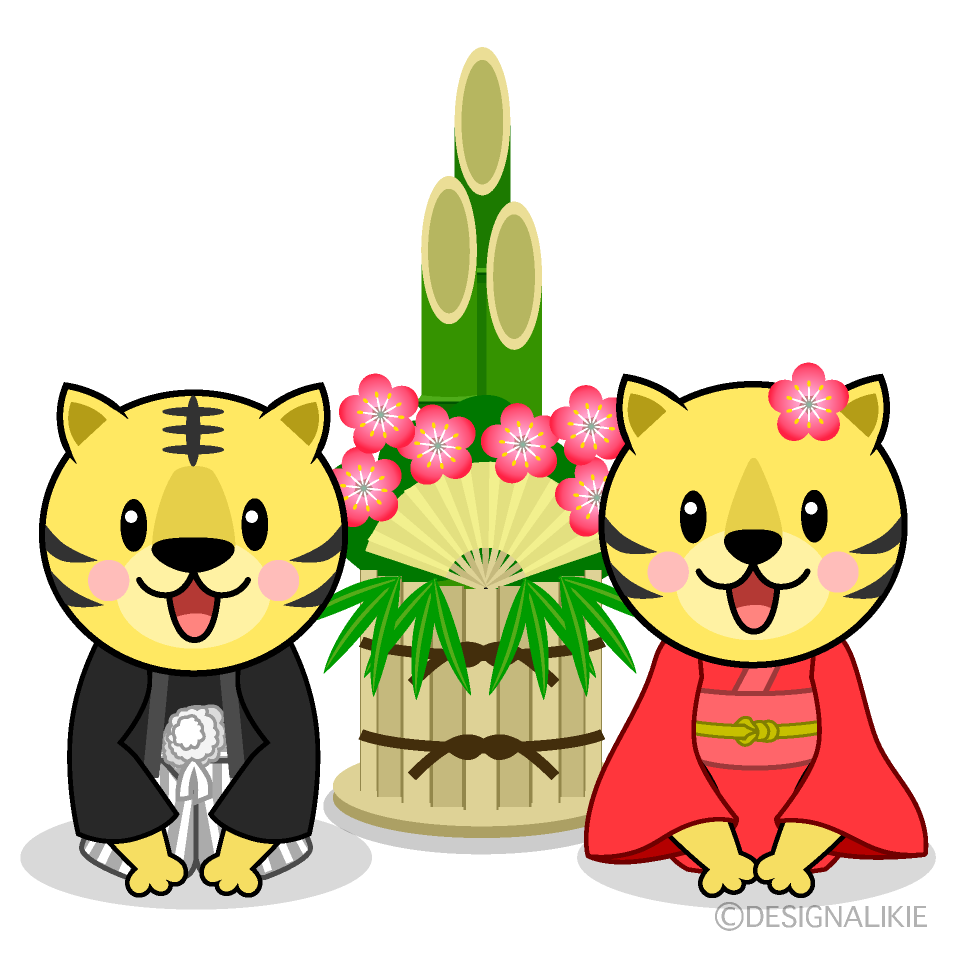 門松と着物のトラ夫婦をデザインした、寅年のお正月イラスト素材です。