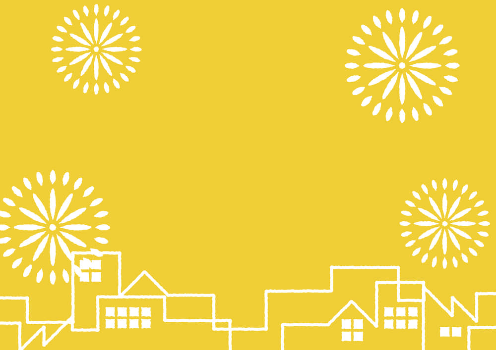 夏祭り 町並み 花火 黄色 背景 イラスト 無料